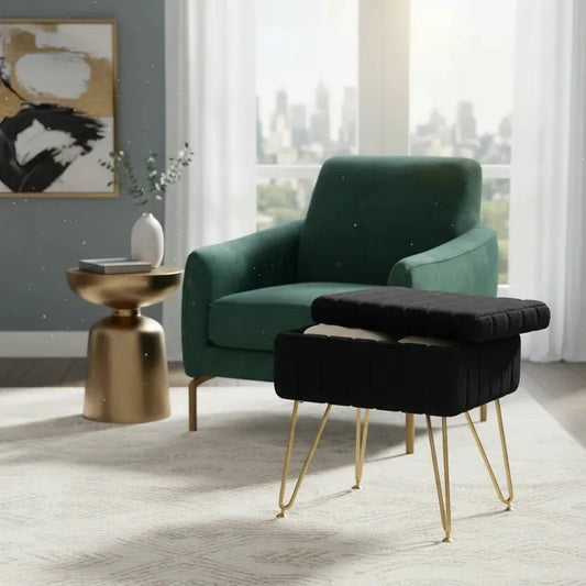 Taburete de Terciopelo con Cajón – Patas de Metal de Calidad NEGRO