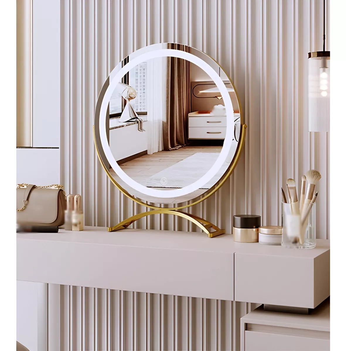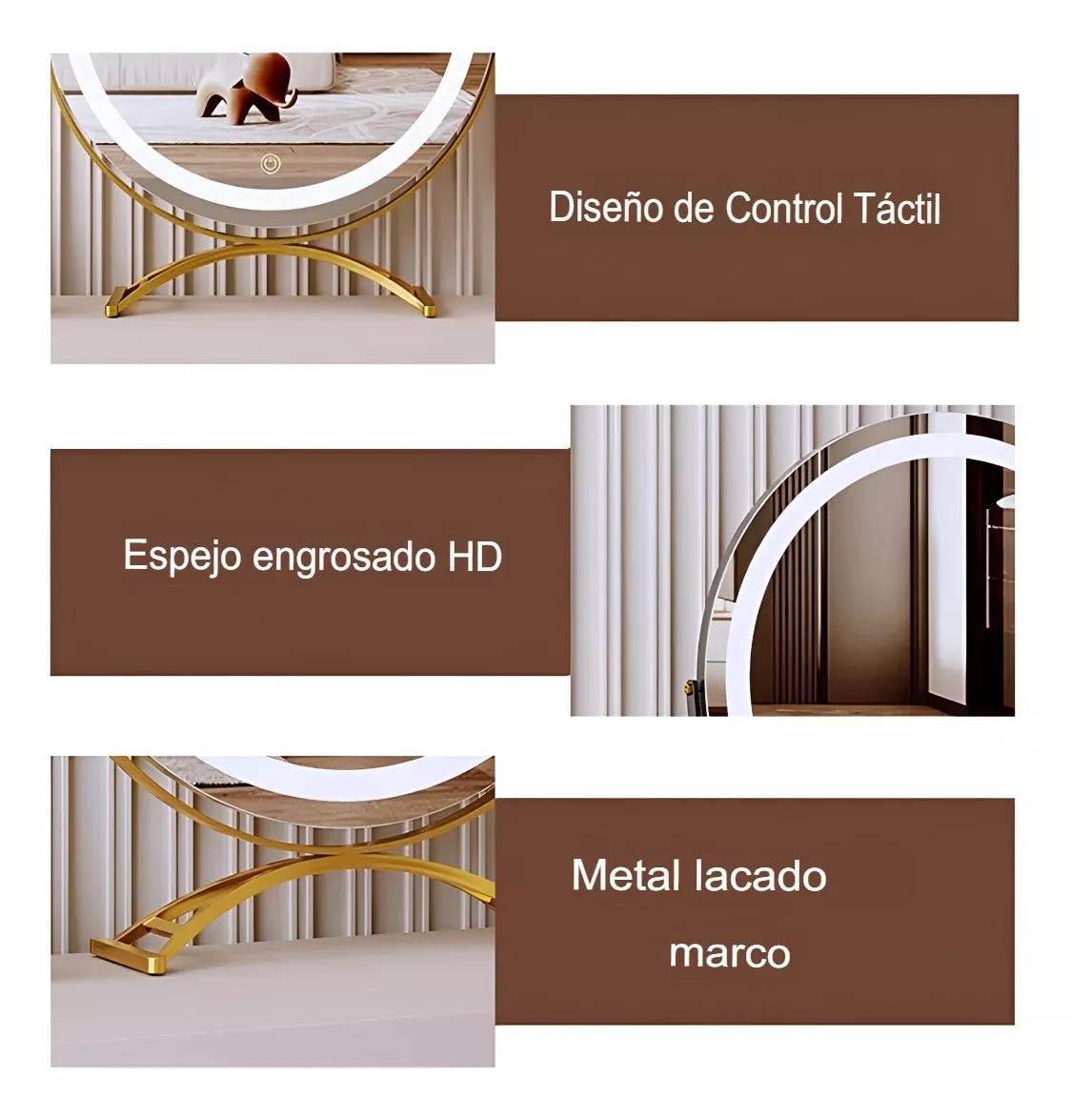 Su diseño de pie facilita su colocación en cualquier superficie plana, brindando estabilidad y comodidad. Este espejo es perfecto tanto para uso personal como para profesionales del maquillaje que buscan calidad y estilo en sus herramientas. Con el espejo de vanidad Feda, cada aplicación de maquillaje se convierte en una experiencia placentera y efectiva.