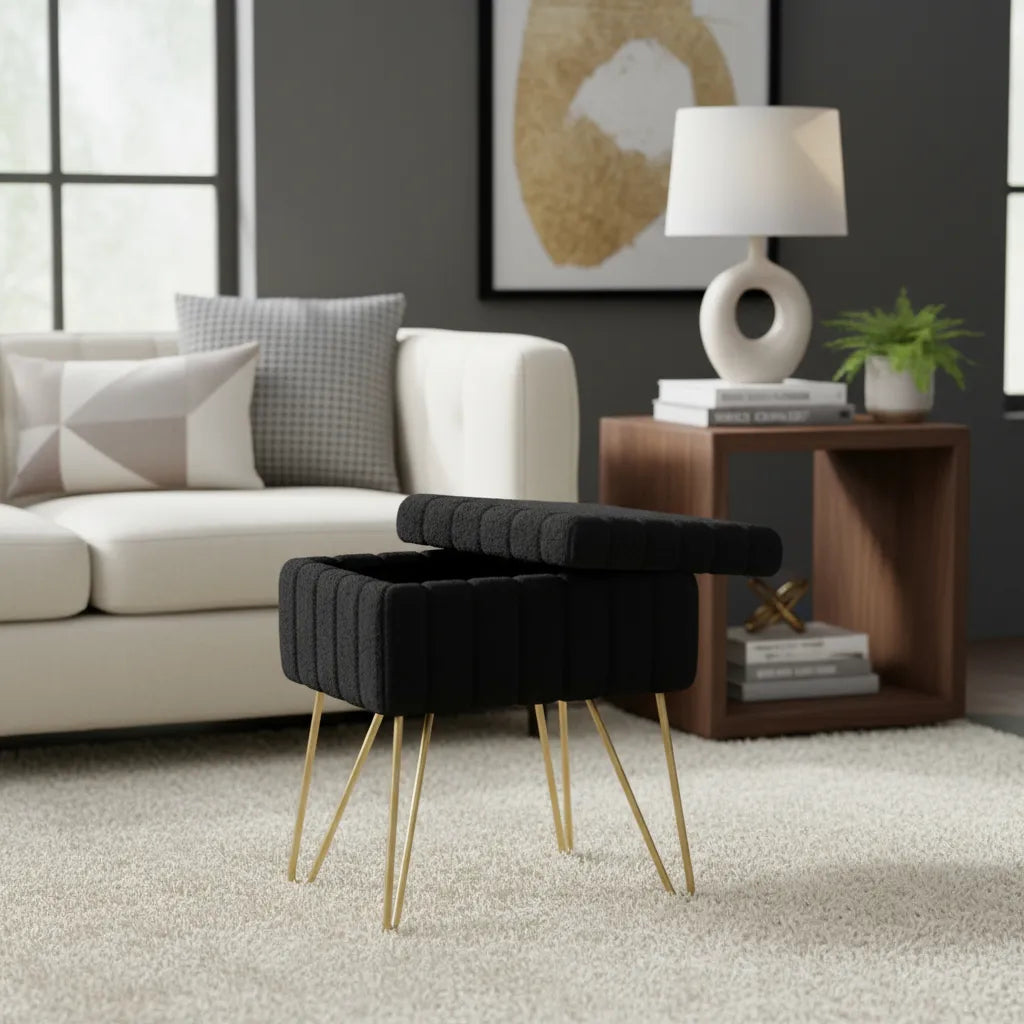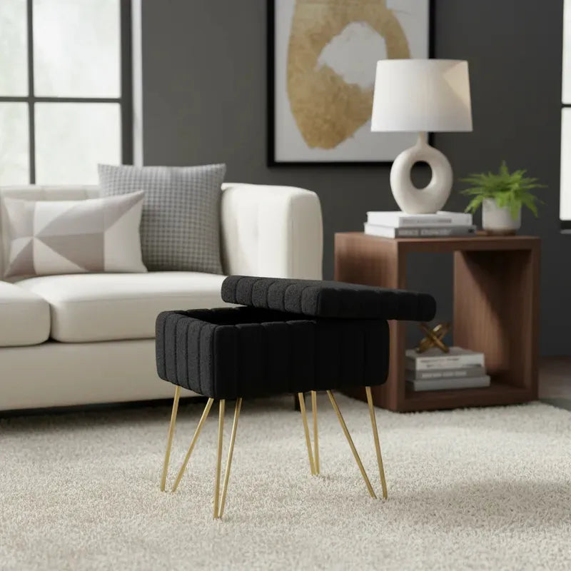 Taburete de Terciopelo con Cajón – Patas de Metal de Calidad NEGRO